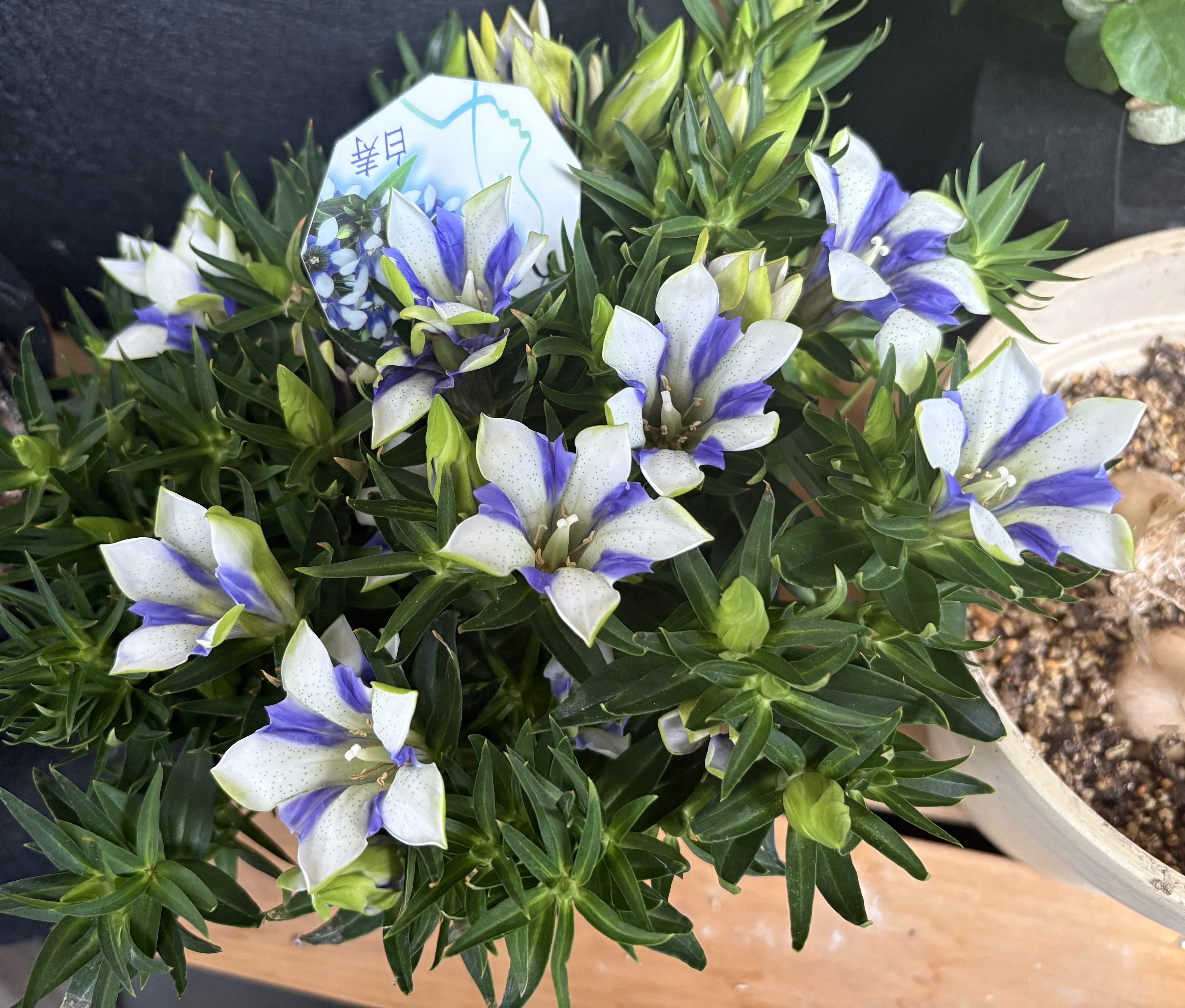 この度は当店をご利用いただき、レビューにもご投稿いただき、ありがとうございました。 リンドウ 心美白寿を気に入ってくださり、大変嬉しいです。 色合いが華やかできれいですよね。 少し乾燥に弱いため、土の表面が乾いたら鉢底から流れるくらいたっぷりと水を与えてあげてください。白と紫のリンドウです