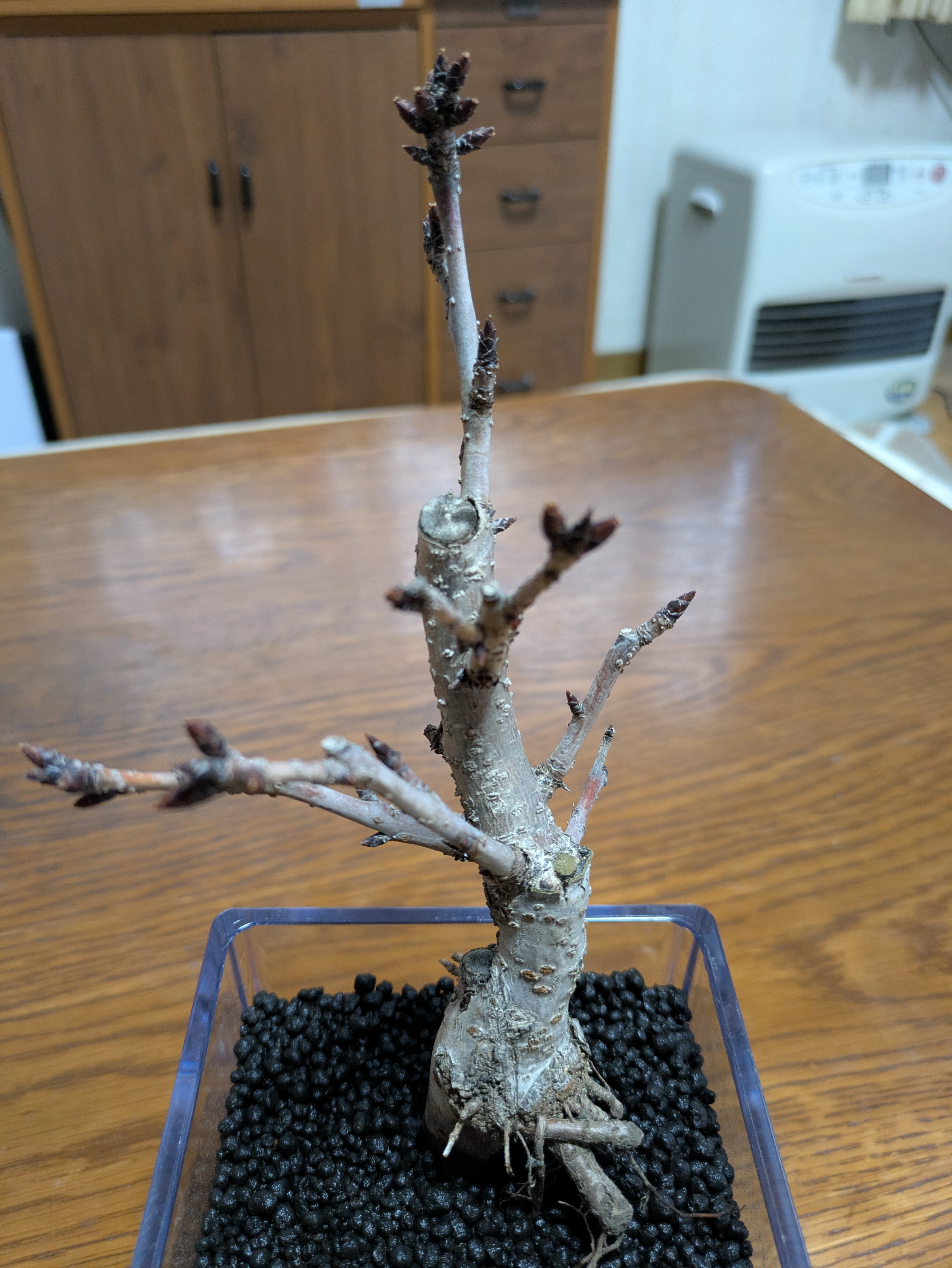 テーブルプランツさくらをお届けする2月〜3月初旬は落葉期で、開花前の状態となります。1つずつの固い花芽から柔らかな花びらが開く瞬間は感動的。華やかに咲いていく姿をお手元で見て、春を感じてください。